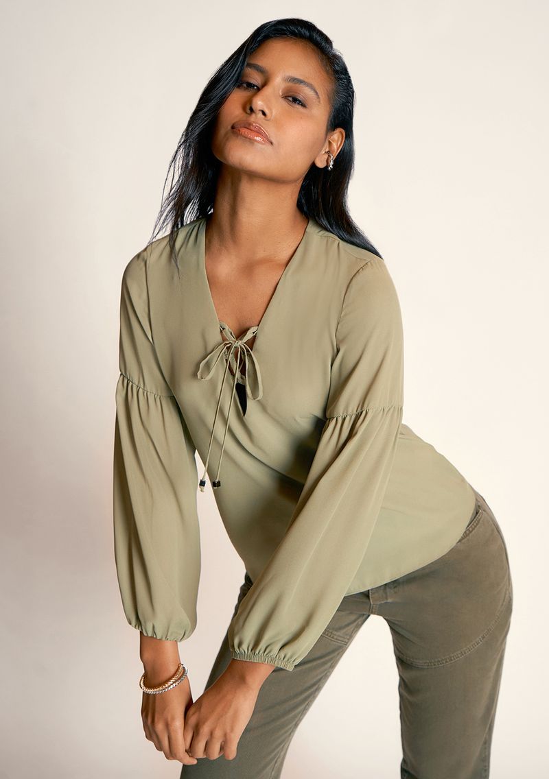 Blusa Zinco Decote V Manga Longa Com Amarração Verde