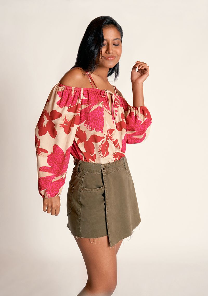 Blusa Zinco Decote Reto Manga Longa Com Amarração Rosa