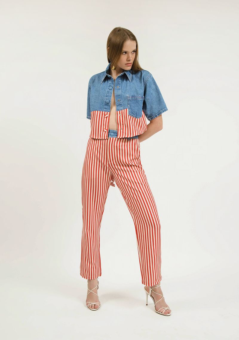 Calça Zinco Reta Cós Alto Composê De Tecidos Azul