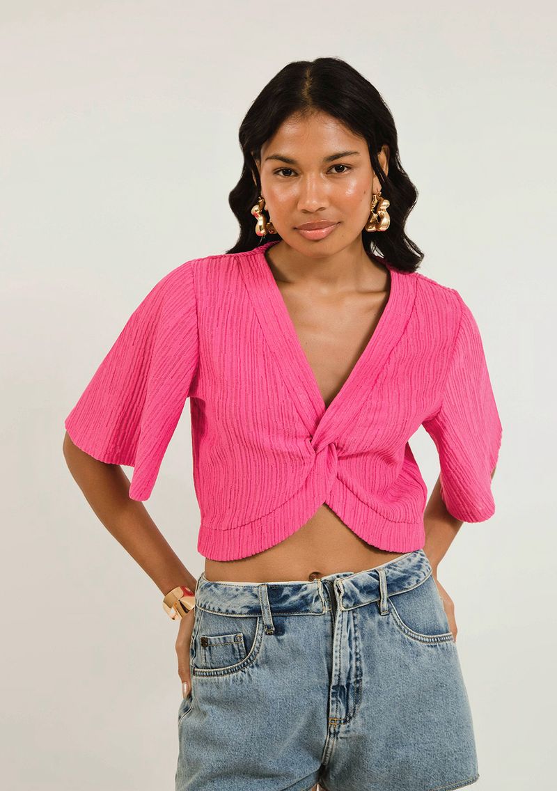 Blusa Zinco Decote V Manga Curta Detalhe Torção Rosa