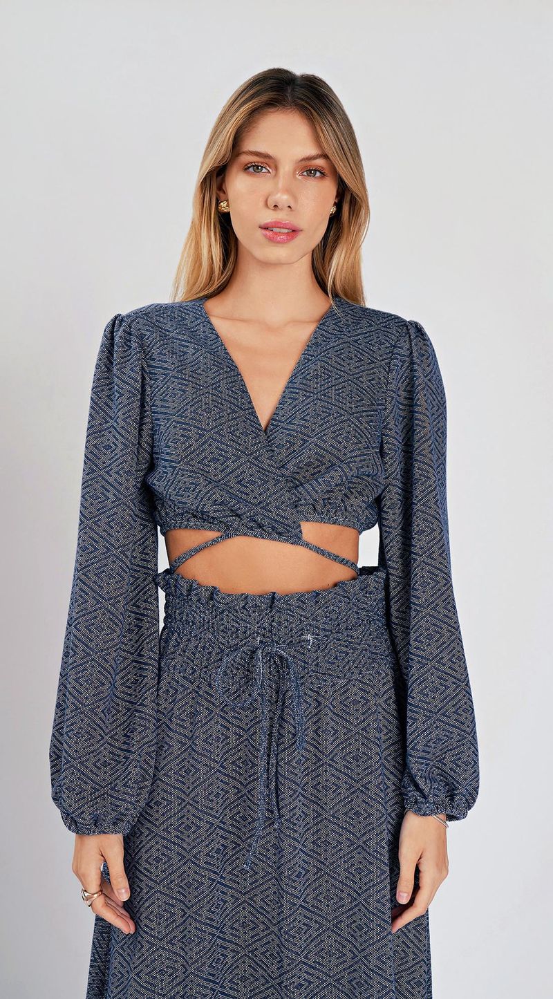 Blusa Zinco Decote V Manga Longa Com Amarração Azul Marinho