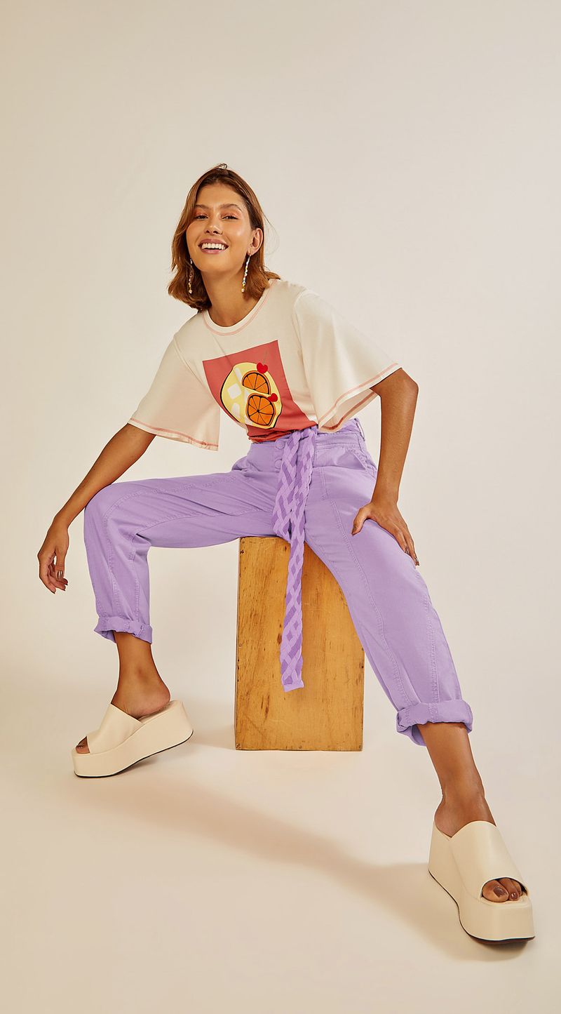 Calça sarja cós alto com recorte. Apesar de clássica, a calça Cenoura é uma ótima opção para usar no trabalho com terninho e com um sapato um pouco mais arrumado, por exemplo. Por outro lado, se você usar com top e uma sandália rasteirinha cria uma opção bem descolada e linda.