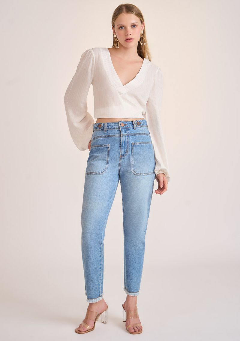 Calça Zinco Mom Cós Alto Detalhe Botão Jeans