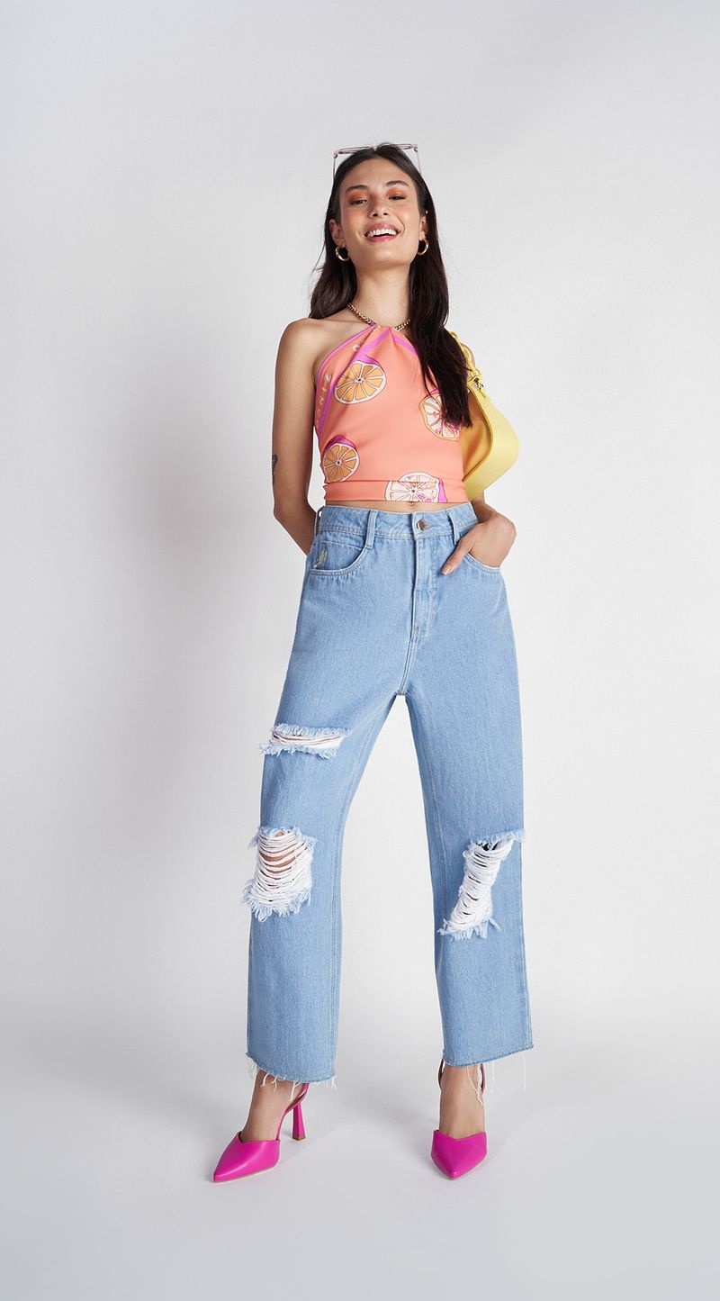 A calça jeans reta com lavanderia clara e puídos estratégicos, proporciona um look com um toque atual e antenado. A modelagem reta deixa o visual mais moderno e vem com tudo nessa temporada, os puídos dão um charme e trazem mais estilo. Você pode combinar com tênis mais descolados ou salto para deixar o visual mais sofisticado!