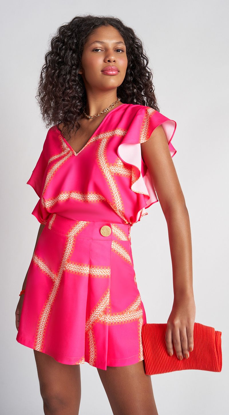 O short-saia conta com a sofisticação de uma saia e é perfeito para quem adora o conforto dos shorts. O charme fica por conta das pregas frontais e o botão que simula madeira. É uma peça versátil e que fica ainda mais linda com nossa estampa exclusiva de cordas. Vem se jogar nessa trend!