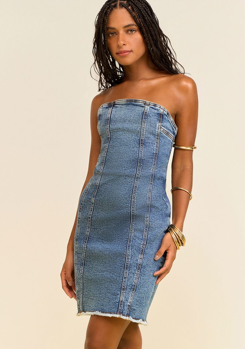 Vestido Zinco Ajustado Decote Reto Sem Alça Curto Azul