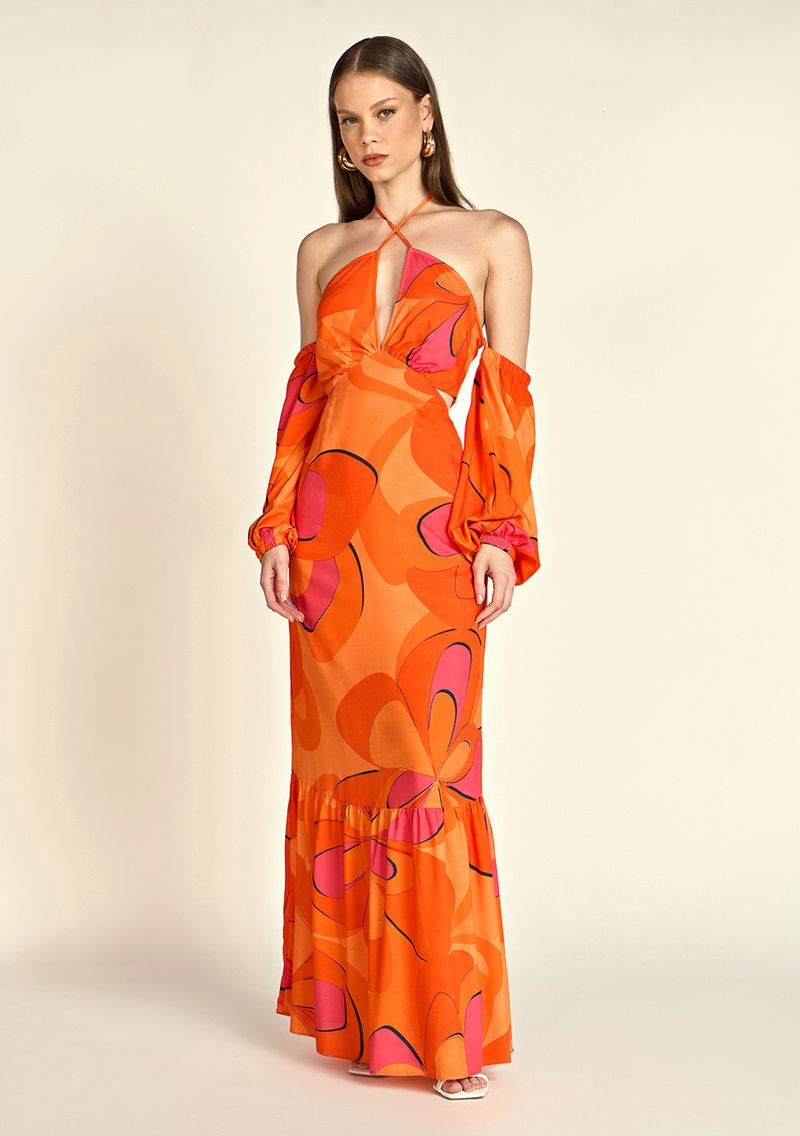 OUTLETRoupasVestidosVestido Zinco Longo Decote V Com Amarração Laranja