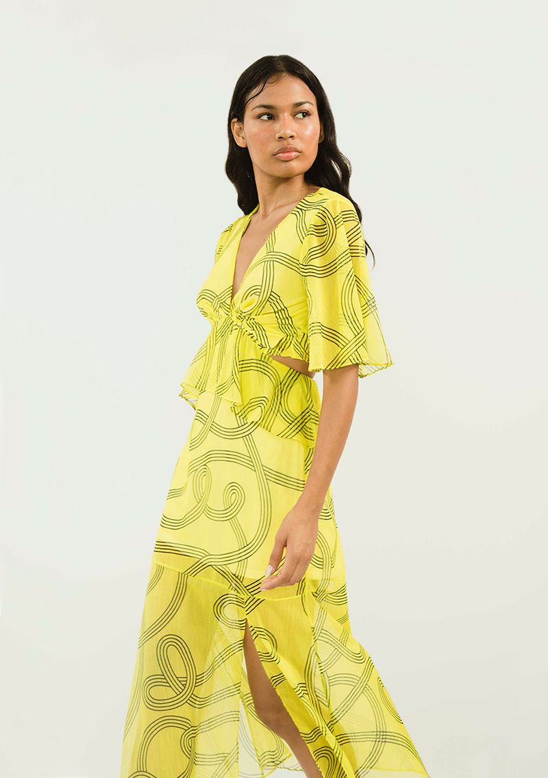 Vestido Zinco Midi Decote V Abertura Lateral Amarelo
