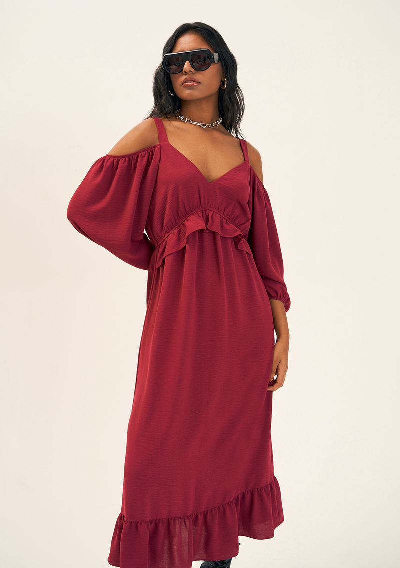 Vestido Zinco Midi Decote V Com Babado Bordo